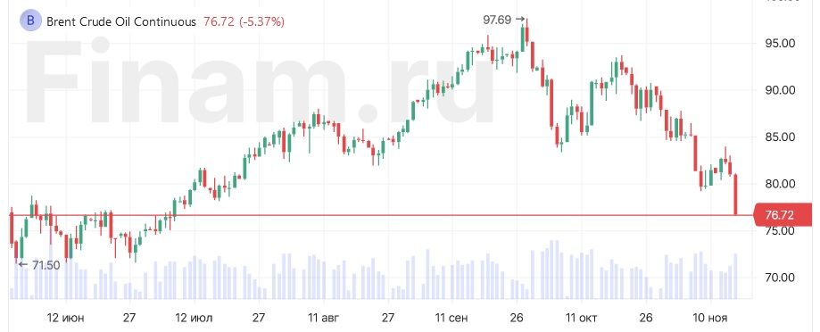 Стоимость нефтяных фьючерсов в четверг вечером ускорила падение, цена Brent оказалась ниже 77 долларов за баррель впервые с июля, свидетельствуют данные торгов. К 21:08 мск Brent опускалась на 5,31%, до 76,87 доллара, WTI – на 5,54%, до 72,41 доллара.