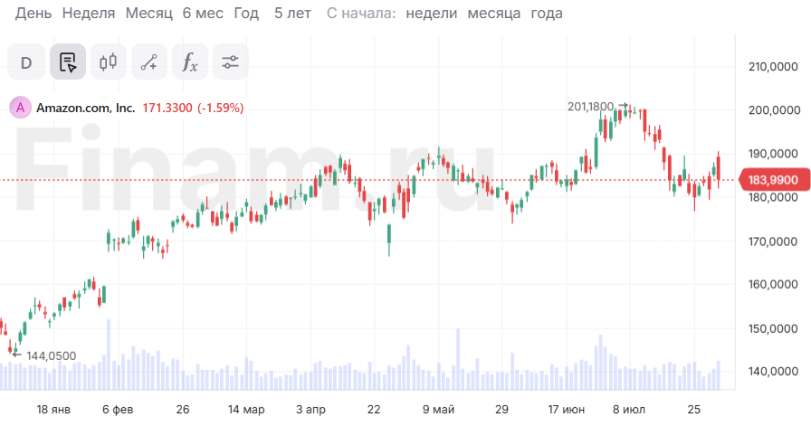 Акции Amazon падают на 1,5% в ходе предторгов в пятницу. А всего в этом году они прибавили 21,5% и 38% за последние 12 месяцев. Акции Amazon поднялись до нового рекордного уровня и достигли рыночной капитализации в 2 трлн долларов в конце прошлого месяца, прежде чем откатиться в июле. Акции потеряли 7% в прошлом месяце на фоне ухода инвесторов из высокотехнологичных акций с высокой капитализацией.