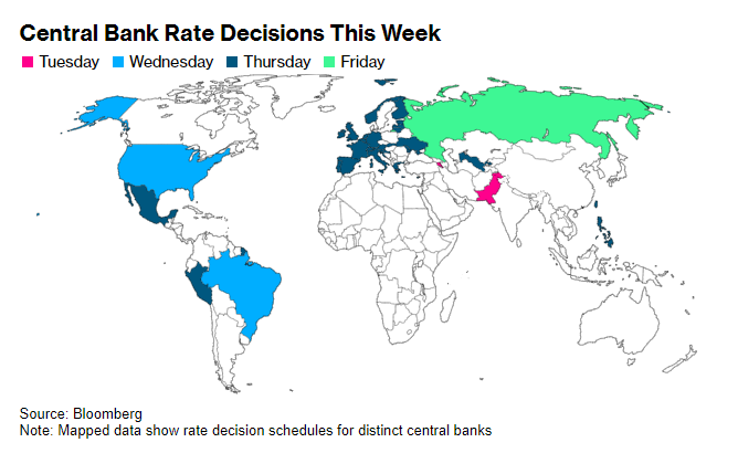 Наибольшее внимание будет направлено на решение Федеральной резервной системы США в среду, за которой в четверг последуют центральные банки, включая банки еврозоны и Великобритании, а также России - в пятницу.